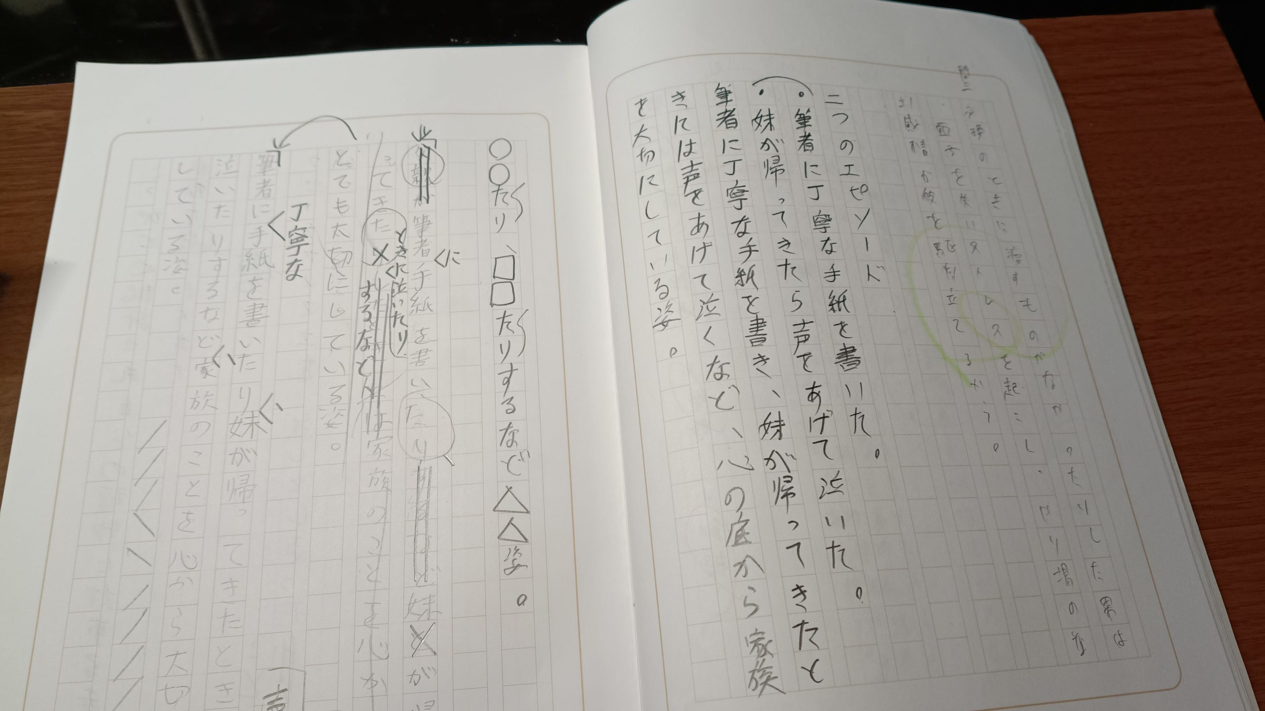 ※これは、教師(私)が原稿ノート(LIFE)に書いた、国語の解答例です。このように解答例を要素のブロックに分けて解説することが多いです。