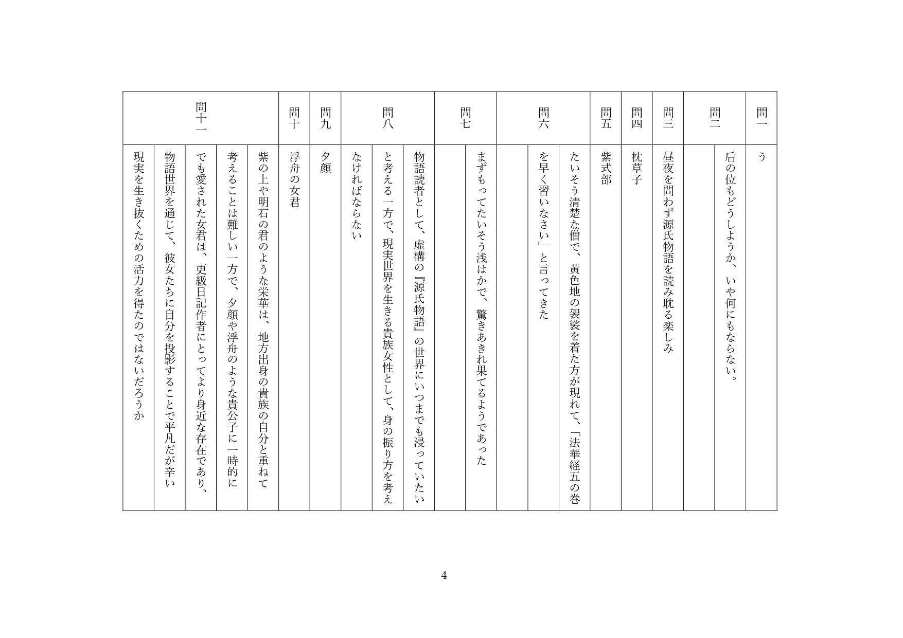 九条さん:更級日記作者が、あこがれの登場人物として、光源氏の愛した(  ケ  )や薫の大将の愛人だった(  コ  )を挙げている点は参考になるね。あえて、メインヒロインである紫の上や、地方の出身だけど大成功した明石の君を挙げていないのはどうしてだろうか。